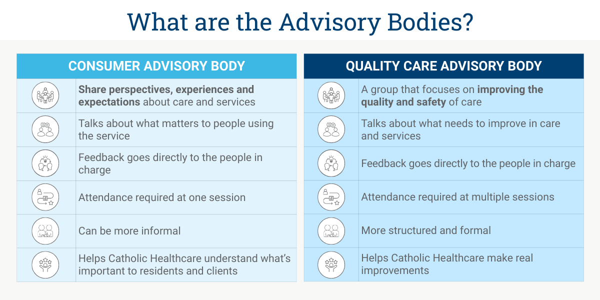 The Catholic Healthcare Consumer Advisory Body (CAB) provides a forum for our residents, clients and their families to voice their opinions on what defines high-quality care and services at Catholic Healthcare. Recommendations from the CAB are then provided to the Catholic Healthcare Board to consider.