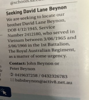 Returned soldier David Beynon, who served in the 1st Battalion of The Royal Australian Regiment Vietnam between 1965 and 1966, recently found himself the subject of an article in the Vietnam Veteran Post.